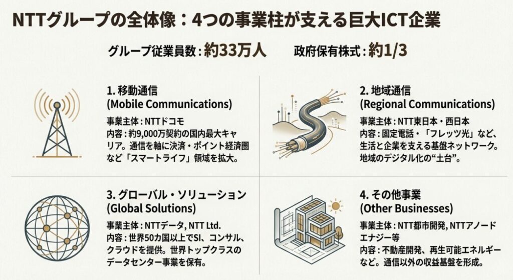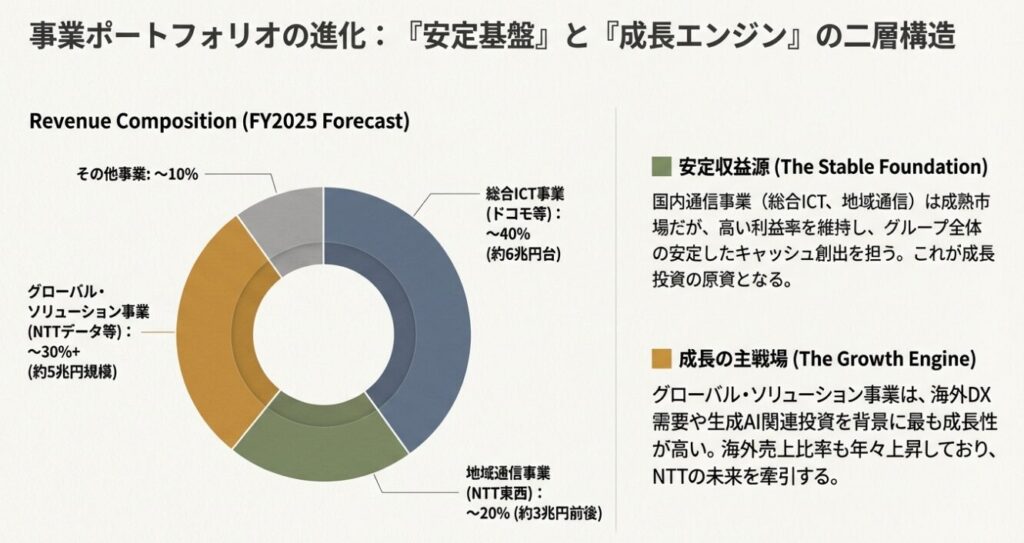 NTTの事業構造は、2025年度時点で「安定収益を生む国内通信」と「成長を担うグローバルIT・データセンター」という二層構造が、よりはっきりとした形になっています。
