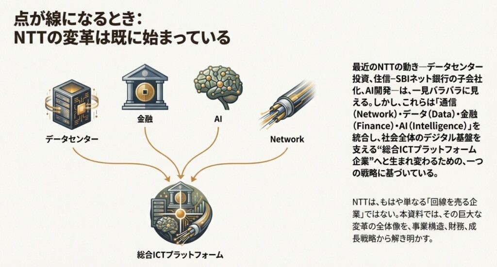 一見するとバラバラに見える「データセンター買収」「ネット銀行の子会社化」「AIへの投資」。しかしその背景には、通信(Network)・データ(Data)・金融(Finance)・AI(Intelligence)をまとめて提供する“総合ICTプラットフォーム企業”への転換という大きな方向性が見えます。